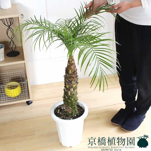 アレカヤシ 学名:Dypsis lutescens 科名/属名:ヤシ科ディプシス属 原産国:マダガスカル 全高:約100cm程度 幅:約85cm程度 鉢サイズ:8号 付属品 ・ナチュラルバスケット鉢カバー(直径約30cm 高さ約30cm) ※天然素材を使った手編み商品のため、サイズには多少の前後がございます。 ・ココファイバー ・受け皿(プラスチック製) ※鉢カバーの中に入れてお届けします。 ※写真と同等の規格の商品をお届けいたします。樹形や葉のつき方には個体差がございます。 ____________________ 南国風の雰囲気を醸し出してくれる観葉植物、アレカヤシ。 ホテルのロビーやレストランによく飾ってあります。 原産国では10mにも生長し、とても大きくなるのが特徴。 日本で最も流通しているヤシの品種です。 ____________________ 育て方 ▽置き場所 夏場は強い直射日光を避けて明るい日陰で、冬場はガラス越しの日光の当たる場所が理想です。 暗い場所では茎が弱々しくなってしまいます。 寒さにあまり強くないので、秋の終わりごろには室内に取り込み暖かい場所で管理してください。 ▽水やり 春から秋の成長期には土の表面が乾いたらたっぷりと。 気温が15℃前後を切ってくると成長が緩慢になるので水やりの回数を減らしてください。 目安としては、土の表面が完全に乾いてから2~3日後に。