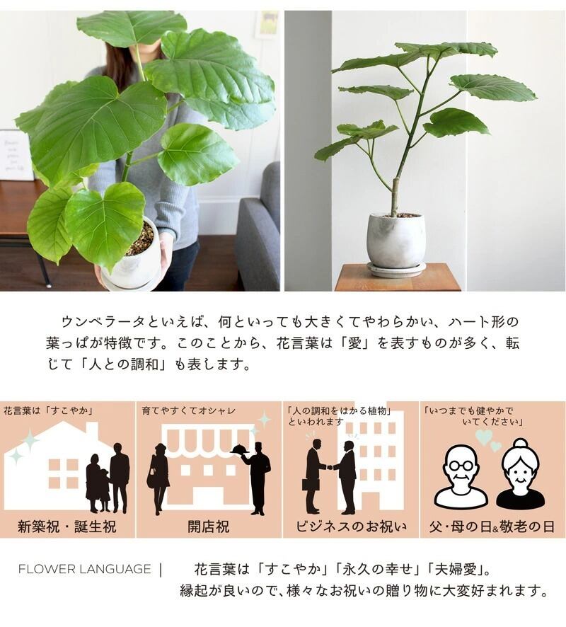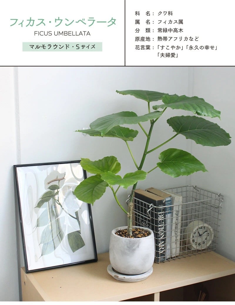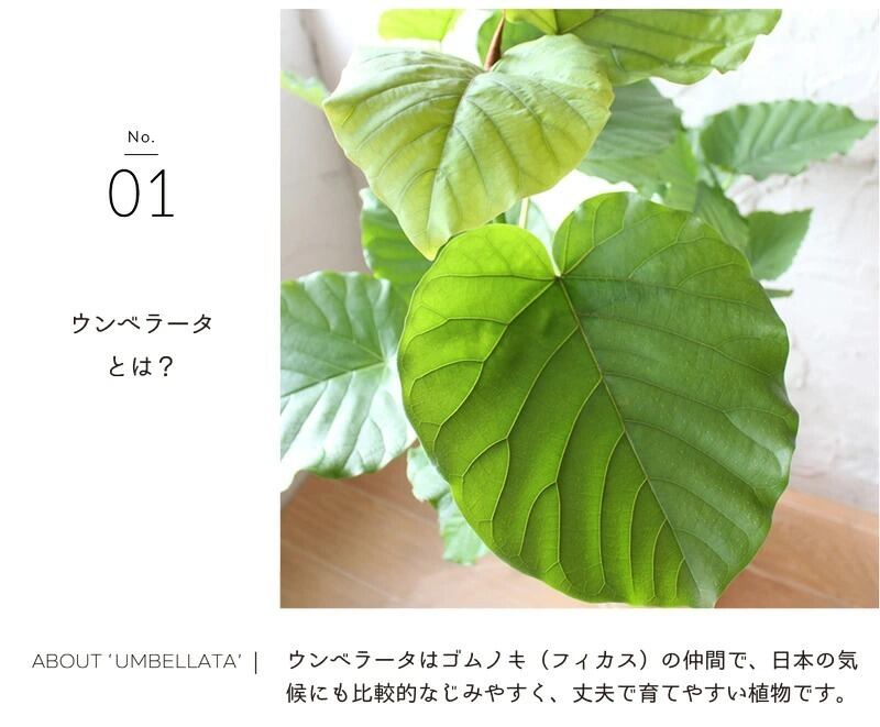 ウンベラータはゴムノキ(フィカス)の仲間で、日本の気候にも比較的なじみやすく、丈夫で育てやすい植物です。