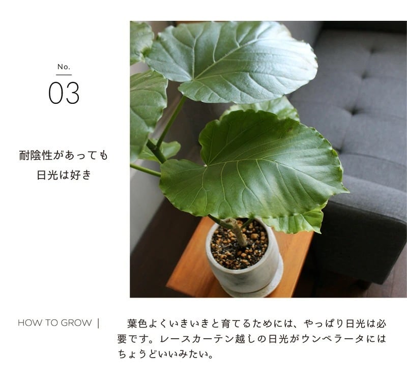 基本的には日当たりを好む植物ですので、戸外でも室内でもできるだけ日当たりの良いところに置きましょう。ただ、真夏の直射日光はウンベラータの柔らかい葉が焼けてしまいますので、レースカーテン越しの光に当てると良いです。